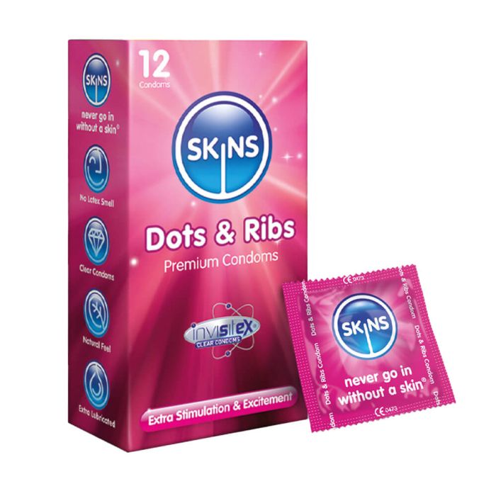 Both of you get to experience more pleasure with the Skins Dots and Ribs condoms. Each of the 12 latex sheaths comes ready lubricated and there are strategically placed raised ribs for his pleasure, while a series of dots around the centre provides her with extra stimulation.